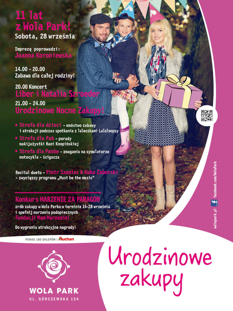 Koncert Libera i Natalii Szroeder, porady makijażystki Hani Knopińskiej, zmagania na symulatorze motocykla-ścigacza, liczne konkursy i promocje – to tylko część atrakcji, które z okazji swoich 11. urodzin przygotowało Centrum Handlowe Wola Park. 28. września zaprasza dużych i małych do wspólnego świętowania!