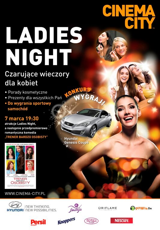 – Ladies Night kolejny raz wkracza do kin Cinema City. Po sukcesie, jakie kobiece spotkania odnosiły przez cały rok, przygotowaliśmy jeszcze więcej atrakcji! Tym razem po raz pierwszy Panie będą mogły wygrać samochód! Nie zabraknie, oczywiście porad ekspertów, upominków oraz tradycyjnie już – przedpremierowego pokazu. Zapraszamy na film „Trener bardzo osobisty” z plejadą hollywoodzkich gwiazd w rolach głównych. Ta zaskakująca i wprawiająca w dobry nastrój komedia romantyczna z pewnością da wszystkim paniom zastrzyk pozytywnej energii! – zapowiada Iwona Kuźnik, dyrektor marketingu i PR Cinema City Poland.