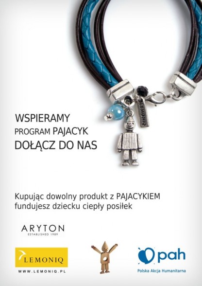 Dzięki przyłączeniu się Arytonu do akcji Pajacyk, każdy zakupiony produkt w postaci bransoletki z pajacykiem w sklepach Aryton stanowi równowartość jednego ciepłego posiłku dla dziecka.