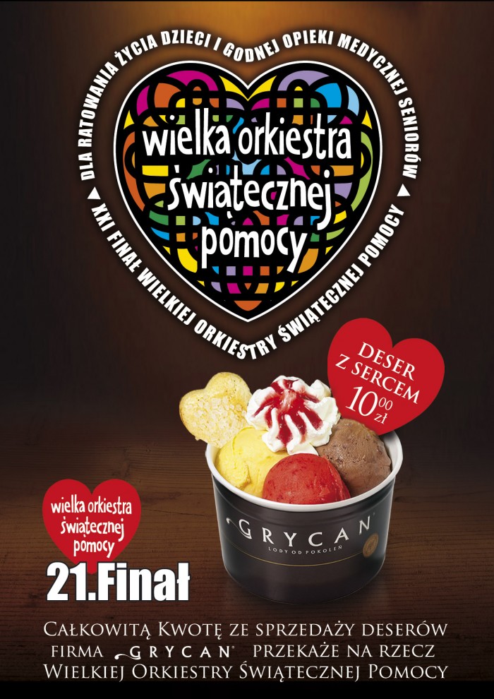 Marka „Grycan – Lody od pokoleń” już po raz trzeci zagra z Wielką Orkiestrą Świątecznej Pomocy. 13 stycznia 2013 roku w lodziarniach pojawi się specjalny Deser z sercem. Całkowita kwota z jego sprzedaży przeznaczona zostanie na tegoroczny cel akcji, którym jest ratowanie życia dzieci i godna opieka medyczna dla seniorów.