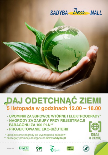 Uprzejmie informujemy, że w dniu 5 listopada w godzinach 12.00 – 18.00 będzie miała miejsce w Centrum Handlowym Sadyba Best Mall przy ul. Powsińskiej 31 impreza ekologiczna pt. „DAJ ODETCHNĄĆ ZIEMI”. Akcja ma na celu kształtowanie świadomości oraz postaw ekologicznych.