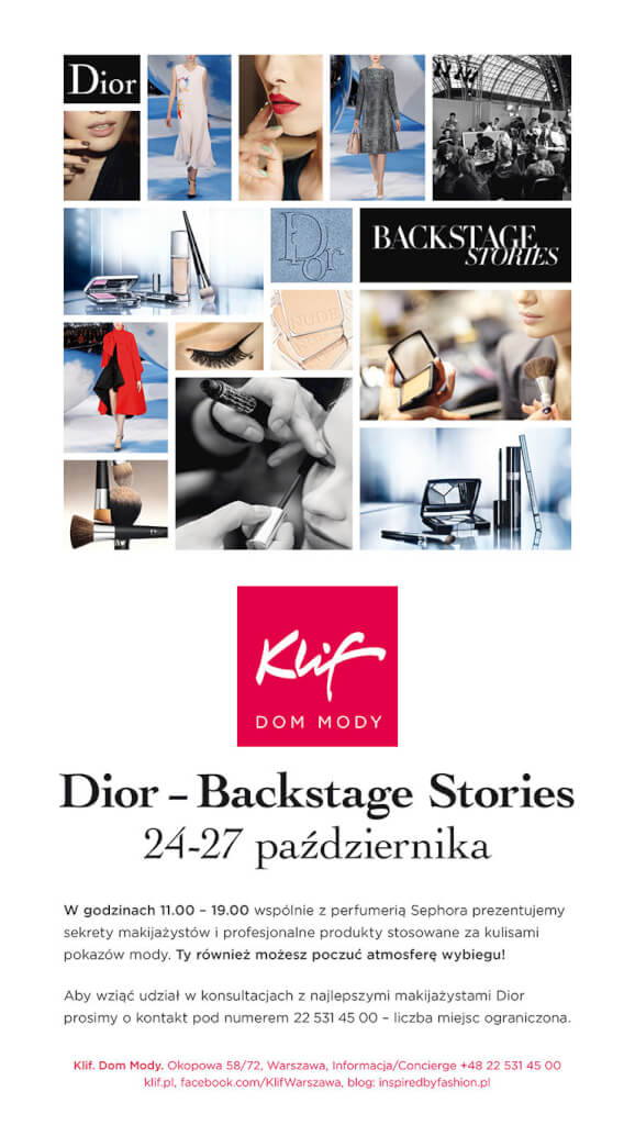 Sekret niezwykłej kobiecości na pokazach Diora, kryje się za kulisami. To tam profesjonalni wizażyści, przy pomocy najlepszych produktów marki, zaczarowują swoje modelki i wydobywają z nich niezwykły blask. To, w jaki sposób tego dokonują do tej pory było tajemnicą. Jednak dzięki zorganizowanym spotkaniom w Klifie, najlepsi styliści Diora podzielą się swoją wiedzą i niezwykłym doświadczeniem wyniesionym prosto z backstage’u światowych pokazów mody.