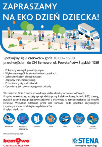 Stena Recycling, lider w dziedzinie odzysku i przetwarzania surowców wtórnych takich jak: makulatura, plastik czy metale, wspólnie z CH Bemowo, organizuje wyjątkową imprezę z okazji Dnia Dziecka. W sobotę 2 czerwca w godzinach 10.00-16.00 przed głównym wejściem do Centrum pojawi się Centrum Recyklingu Stena, w którym dzieci dowiedzą się jak poprawnie segregować surowce wtórne, co to jest recykling, w jaki sposób można przerobić stare gazety na nowy papier, wezmą udział w warsztatach sitodruku na koszulkach i będą uczestniczyć w różnych konkursach z nagrodami.