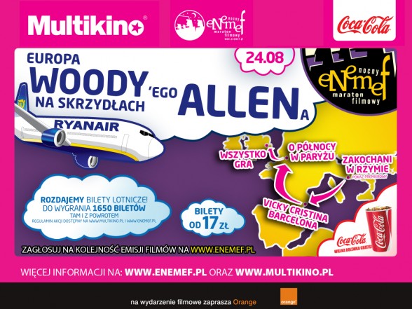 Multikino i Enemef zapraszają na wyjątkową przygodę: podróż po Europie z Woodym Allenem i liniami lotniczymi Ryanair. Kupując bilet na maraton zapewniasz sobie udział w konkursie, w którym do wygrania jest aż 1650 biletów lotniczych w dwie strony do jednego z kilkunastu europejskich miast.