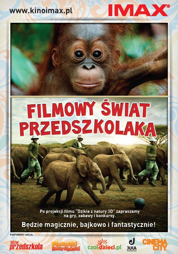 W ramach nowego projektu edukacyjnego IMAX – „Filmowy Świat Przedszkolaka” na dzieciaki czeka nie tylko wzruszająca opowieść o przywiązaniu i nadzwyczajnej więzi między ludźmi i zwierzętami – film „Dzikie z Natury 3D”, ale także masa gier i quizów, oczywiście zawierających garść ciekawostek edukacyjnych o życiu zwierząt oraz ochronie przyrody. Świetna zabawa gwarantowana!