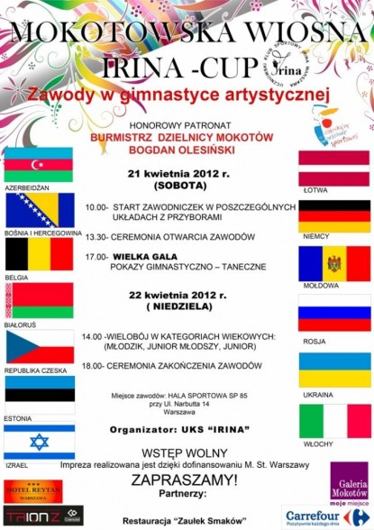 Na warszawskim Mokotowie odbędzie się V edycja międzynarodowych zawodów w gimnastyce artystycznej o nazwie „Mokotowska Wiosna Irina-Cup”. W dniach 21-22 kwietnia zawodnicy z 15 europejskich państw zaprezentują jedyne w swoim rodzaju układy taneczno-gimnastyczne z wykorzystaniem swojej kultury oraz folkloru.