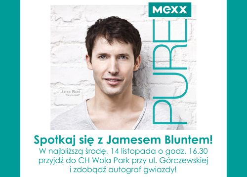 Znany brytyjski wokalista, James Blunt, 14 listopada br. przyjedzie z jednodniową wizytą do Polski. Blunt odwiedzi Warszawę jako ambasador zapachów MEXX Pure, dedykowanych młodym, dynamicznym ludziom. W środę o godz. 16.30 James Blunt spotka się w warszawskim Centrum Handlowym Wola Park przy ulicy Górczewskiej ze swoimi fanami. Każdy z przybyłych będzie mógł otrzymać autograf artysty, porozmawiać z nim oraz sfotografować się w jego towarzystwie.