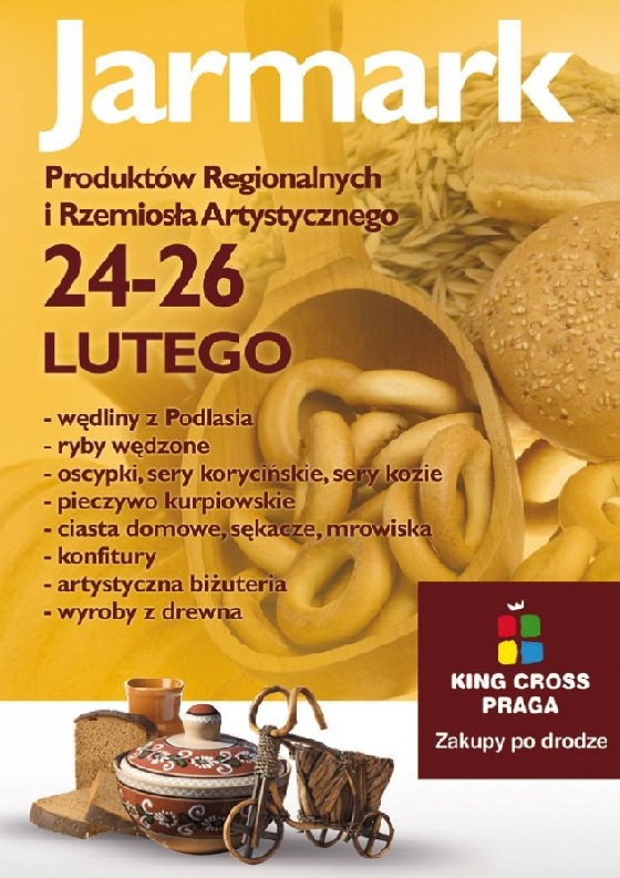 Jarmark Produktów Regionalnych i Rzemiosła Artystycznego w King Cross Praga potrwa do 26 lutego. Produkty spożywcze będzie można kupić na stoiskach zlokalizowanych na placu przy sklepie RTV Euro AGD, natomiast Jarmark Rzemiosła Artystycznego odbędzie się na placu przed restauracją McDonalds.