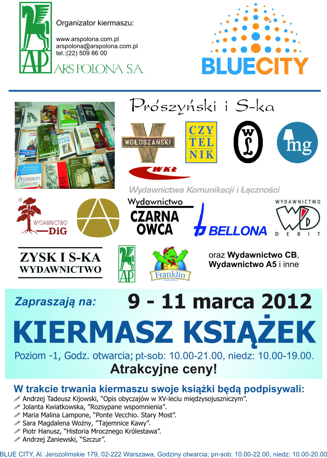 Zapraszamy do odwiedzenia centrum handlowego Blue City w Warszawie w dniach 9-11 marca. Podczas tego weekendu razem z Blue City organizujemy kiermasz książki. W atrakcyjnych cenach będzie można kupić ulubioną książkę, nowości wydawnicze, książki dla najmłodszych oraz spotkać się z autorami, uzyskać ich autograf i porozmawiać z nimi.