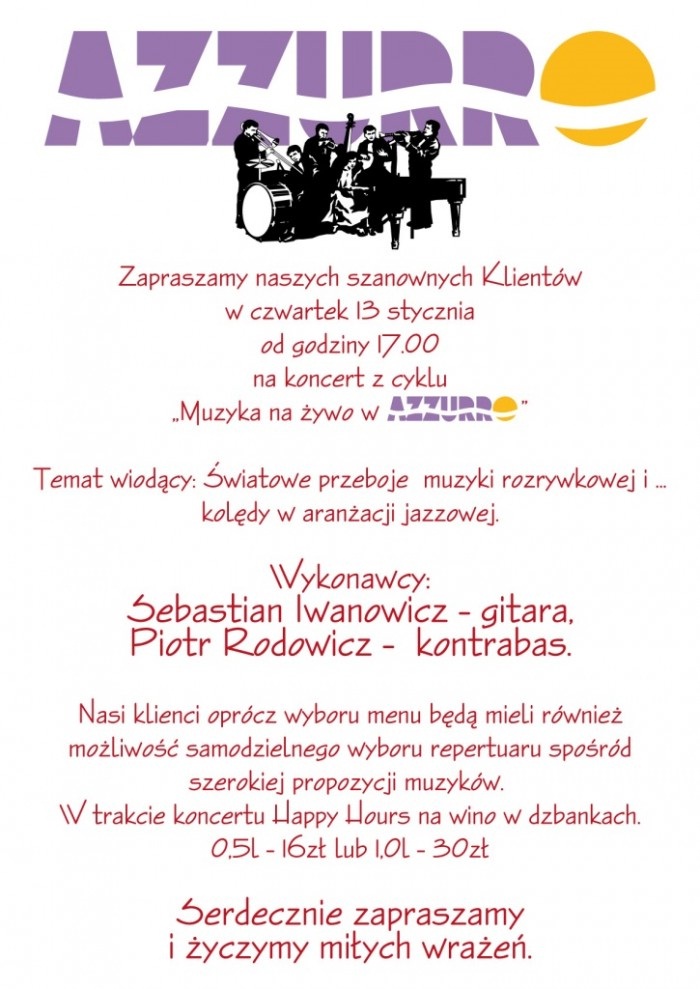 Tematem wiodącym koncertu będą światowe przeboje muzyki rozrywkowej, a także brzmiące jeszcze echem Świąt, kolędy w nietypowej, bo jazzowej aranżacji. Wśród instrumentalistów, których będzie można usłyszeć w Azzurro, znaleźli się gitarzysta – Sebastian Iwanowicz oraz grający na kontrabasie – Piotr Rodowicz. Oprócz wyboru menu, będzie także możliwość wybrania utworu, który mają zagrać artyści, spośród oferowanego przez nich materiału. Organizatorzy przygotowali na ten wieczór specjalne promocje cenowe.