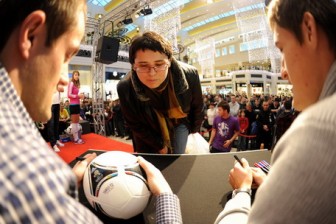 Kilka minut po godzinie 15 przy aplauzie zgromadzonych fanów na scenie pojawili się „Żyrko” i „Rado”. Wchodzących piłkarzy pozdrowili zgromadzeni kibice. Zawodnicy chwilę później podzielili się swoimi wrażeniami po piątkowym losowaniu grup EURO 2012. – Myślę, że wszystko ułożyło się znakomicie. Mamy szanse, aby wyjść do ćwierćfinału i musimy ją wykorzystać – powiedział Michał Żyro. Młody legionista nie miał problemów ze wskazaniem faworytów imprezy, która za kilka miesięcy odbędzie się na boiskach Polski i Ukrainy. – Tradycyjnie są nimi Holendrzy, Niemcy i Hiszpanie – powiedział wychowanek Akademii Piłkarskiej.