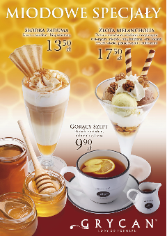 Złota melancholia – kompozycja trzech smaków lodów (pistacjowych, truflowych i orzech włoski) podana z bitą śmietaną i orzechami włoskimi zatopionymi w gorącym miodzie to wyjątkowy deser dla tych, którzy mają ochotę na lody przez cały rok, Słodka zaduma – wyśmienita kawa parzona ze specjalnie wyselekcjonowanych ziaren, z dodatkiem bitej śmietany, miodu i cynamonu – idealna na chłodny poranek, Gorący szept – gorąca herbata osłodzona miodem z dodatkiem cytryny i imbiru, z pewnością rozgrzeje w jesienne popołudnie. Każda z przygotowanych dla klientów propozycji kusi wyśmienitym smakiem i niecodziennym połączeniem składników.