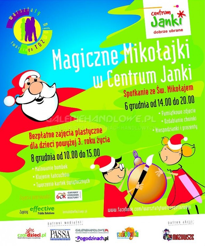 Tego dnia dzieci uczestniczyć będą w zajęcia plastycznych w ramach „Warsztatów twórczego rozwoju”. Program sobotniego spotkania pod hasłem „Tworzymy dekoracje choinkowe” obejmuje zajęcia z kolażu i scrapbookingu. Przy zastosowaniu styropianowych kul, kolorowego papieru, piórek, brokatu i różnych świecących dodatków, dzieci stworzą własne, niepowtarzalne bombki, gwiazdki i łańcuchy choinkowe. Wykonane ozdoby będzie można zabrać do domu lub powiesić na choince w Centrum Janki. Prowadzący zajęcia plastycy Gminnego Ośrodka Kultury w Raszynie pomogą również zaprojektować unikalne kartki świąteczne.