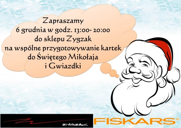 Opis: Przy użyciu produktów marek: Fiskars, Ursus, Instant, Pritt, Stabilo i Maped dostępnych w sklepie Zygzak, będą wykonywane kartki do św. Mikołaja zawierające listę wymarzonych przez dzieci prezentów.