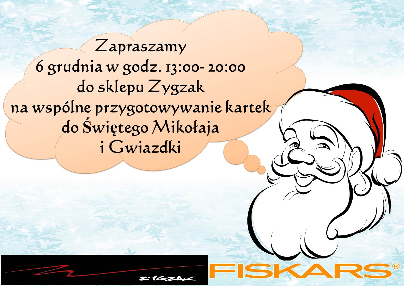 Opis: Przy użyciu produktów marek: Fiskars, Ursus, Instant, Pritt, Stabilo i Maped dostępnych w sklepie Zygzak, będą wykonywane kartki do św. Mikołaja zawierające listę wymarzonych przez dzieci prezentów.