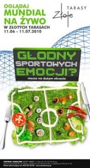 Złote Tarasy zapraszają miłośników futbolu do wspólnego oglądania rozgrywek Mistrzostw Świata 2010. Z tej okazji na placu zewnętrznym centrum ulokowany zostanie specjalny ekran o rozmiarach 2,5 x 3,5 metra, na którym od 11 czerwca aż do 11 lipca można będzie oglądać mundialowe zmagania drużyn piłkarskich.