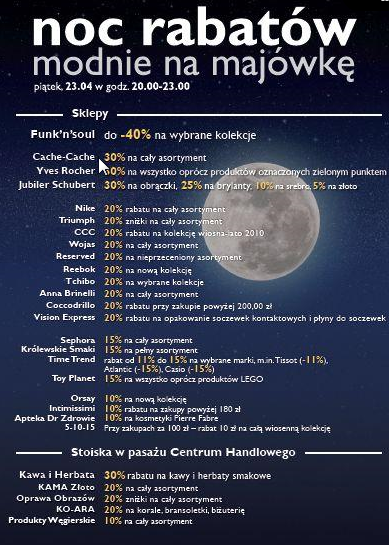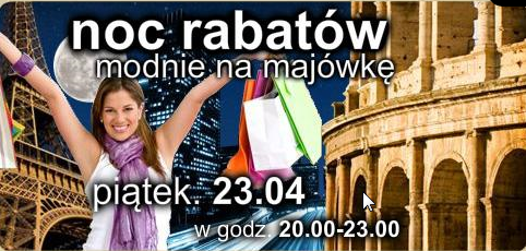 Już w piątek, 23 kwietnia, od godziny 20:00 do 23:00 Noc Rabatów w Centrum Handlowym King Cross Praga. Tuż przed weekendowymi wyprawami wyjątkowe rabaty na kolekcje, w które ubierzesz siebie i całą swoją rodzinę. Zniżki nie tylko na ubrania, ale również na kosmetyki, biżuterię, upominki i zabawki.
