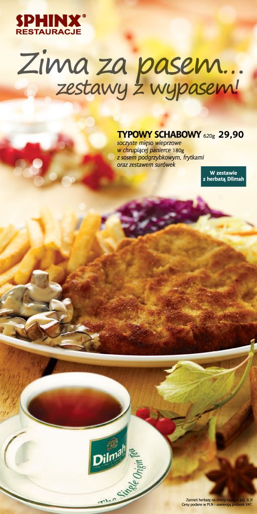 Sphinx i Chłopskie Jadło – sieci restauracji zarządzane przez Sfinks Polska – 5 listopada wprowadzają nowe propozycje kulinarne. W ramach oferty „Zima za pasem, zestawy z wypasem” klienci restauracji Sphinx mogą zamówić kotleta schabowego w chrupiącej panierce lub smażoną doradę, serwowane w zestawie z dodatkami i herbatą Dilmah.
