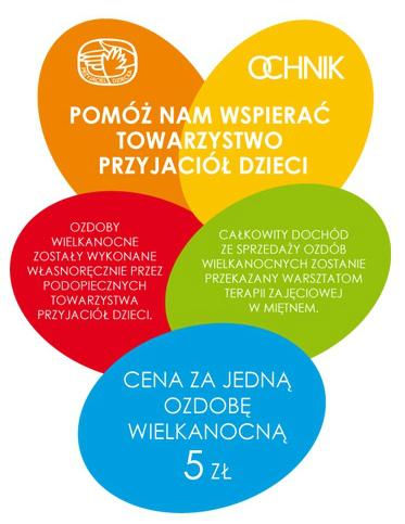 W tym roku, podobnie jak w latach poprzednich OCHNIK zorganizował akcję sprzedaży ozdób wielkanocnych, wykonanych własnoręcznie przez podopiecznych Towarzystwa Przyjaciół Dzieci. Zarówno i tym razem, odniosła duży sukces. Sprzedano 940 dekoracji wielkanocnych, m.in.: baranków, figurek z masy solnej czy przystrojonych jajeczek. Dzięki hojności klientów, zebrano kwotę w wysokości 4 700 zł. Dochód ze sprzedaży ozdób w całości przekazany został na cele Towarzystwa Przyjaciół Dzieci.