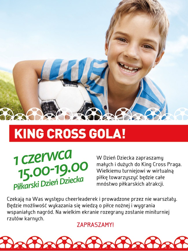 W najbliższy piątek, 1 czerwca, na terenie centrum handlowego rozegrany zostanie wielki Turniej Piłkarski o Puchar King Cross Praga. Turniej rusza o godz. 15:00 losowaniem finałowych „dwójek”. Zawodnicy walczyć będą o przejście do kolejnych etapów rozgrywek i o wygraną całego turnieju.