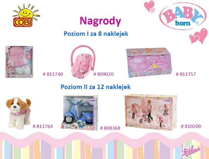 Niedawno amerykański potentat zabawkowy Toys“R”Us przystąpił do programu lojalnościowego Baby Born. Za zakup produktów Zapf Creation za min. 40 zł klient otrzymuje naklejkę Cobi. Odpowiednią ilość naklejek można wymienić na prezent.
