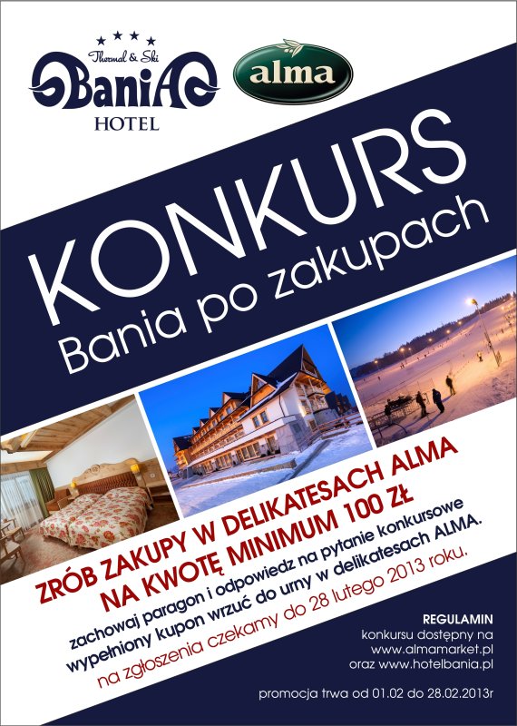 1 lutego rozpoczął się wspólny konkurs Term Bania i Delikatesów Alma. Do wygrania wspaniała nagroda główna – rodzinny pobyt w kurorcie Termy Bania. W konkursie mogą wziąć udział osoby, które w terminie 01.02.2013 do 28.02.2013r. dokonają zakupów w Delikatesach Alma za kwotę nie mniejszą niż 100 złotych.