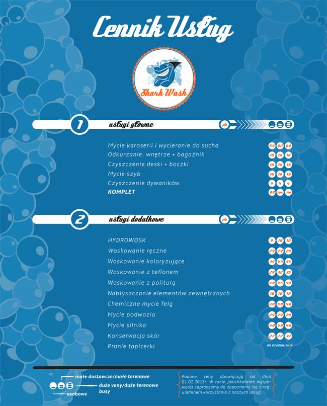W ofercie szeroka gama zabiegów – od standardowego mycia zewnętrznego wraz z suszeniem, przez ręczne woskowanie specjalistycznym woskiem z teflonem, aż do prania tapicerki. W cenniku znajdą Państwo szczegółową listę usług, wraz z tzw. czyszczeniem kompletnym, którego cena dla samochodu osobowego to 99 PLN. O bezpieczeństwo samochodów oraz szczegółową kontrolę dba kadra kierownicza z wieloletnim doświadczeniem w branży.