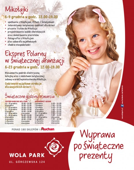 W dniach 6-23 grudnia Centrum Handlowe Wola Park przygotowało dla klientów wyjątkowe niespodzianki. Święty Mikołaj zabierze dzieci w niezapomnianą podróż – tym razem jednak nie zaprzęgiem reniferów, lecz świąteczną, elektryczną kolejką. Natomiast podczas czterodniowych Mikołajek najmłodsi będą mieli okazję m.in. obejrzeć interesujący spektakl czy też wspólnie zaprojektować ozdoby choinkowe!