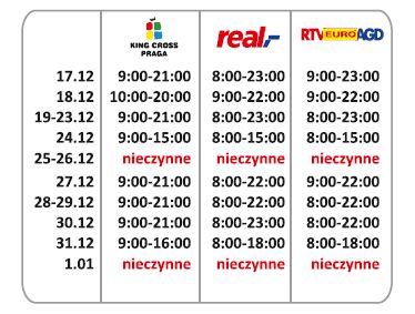 Informujemy, że w dniach 25 – 26 grudnia oraz 1 stycznia CH King Cross Praga będzie nieczynne.
