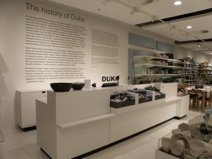 Fit out sklepów związany jest z nowym konceptem marki. Kitchen life to styl spędzania czasu wolnego z marką Duka. „Kuchnia to moje ulubione miejsce w domu” – ta kwintesencja stylu życia miłośników skandynawskiego designu Duka. Kuchnia to nie tylko miejsce przygotowywania i spożywania posiłków. Kuchnia to centrum każdego domu, przestrzeń, w której odpoczywamy, spędzamy czas z rodziną i przyjaciółmi, pracujemy i bawimy się. Nowa Duka jest biała, świeża i nowoczesna. Charakter marki podkreśla drewniana podłoga malowana na biało, jasne ściany oraz meble w tym samym kolorze. W nowej odsłonie sklepów, Duka jest jeszcze bardziej przyjazna Klientom – ma obniżony system regałów, aby swobodnie mogli sięgnąć po dowolny produkt.