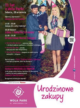 Punktem kulminacyjnym wydarzenia będzie koncert Libera i Natalii Szroeder. Na scenie wystąpią także zwycięzcy tegorocznej edycji programu „Must be the music” – Piotr Szumlas i Kuba Zaborski. Zwieńczeniem dnia będą Urodzinowe Nocne Zakupy – między 21.00 a 24.00 miłośnicy zakupów skorzystają ze specjalnych, urodzinowych promocji! W dokonaniu odpowiednich wyborów pomoże najnowszy numer magazynu „Wola Park. Sztuka zakupów”, który prezentuje trendy, kolory i fasony obowiązujące w tym sezonie oraz nowości ze świata kultury.