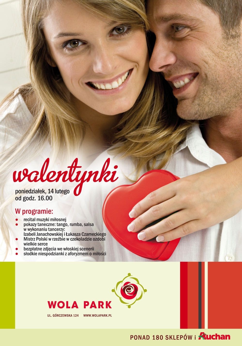 Centrum Handlowe Wola Park zaprasza w poniedziałek, 14 lutego br., od godziny 16-ej, na wspólne świętowanie Dnia Zakochanych. Organizatorzy przygotowali wiele atrakcji – nie zabraknie miłosnych piosenek, pokazów tańca i słodkich niespodzianek. Z okazji Walentynek, Centrum Handlowe Wola Park przygotowało dla swoich klientów bogaty program artystyczny, który z pewnością przypadnie do gustu nie tylko zakochanym. Główną atrakcją będzie recital muzyki miłosnej w wykonaniu Doroty Chojnackiej. Wprowadzeni w romantyczny nastrój goście, będą mogli  obejrzeć pokaz tanga, rumby i salsy w wykonaniu Izabeli Janachowskiej i Łukasza Czarneckiego – profesjonalnych tancerzy, uczestników programu telewizyjnego „Taniec z Gwiazdami”. Inną atrakcją będzie ozdabianie wielkiego (1,5×1,2m!) serca przez mistrza Polski w rzeźbieniu w czekoladzie. Dla zakochanych tęskniących za słońcem i romantyczną atmosferą Wiecznego Miasta, organizatorzy przygotowali możliwość bezpłatnego sfotografowania się na tle Koloseum, na kultowym skuterze marki Vespa. Uwiecznieni na zdjęciu będą mogli poczuć się jak Gregory Peck i Audrey Hepburn w słynnym filmie Williama Wylera „Rzymskie Wakacje”. Na spragnionych słodkich niespodzianek czekać zaś będą darmowe ciasteczka z aforyzmem o miłości. Liczne atrakcje w Wola Park z pewnością uczynią Dzień Zakochanych jeszcze bardziej wyjątkowym. Centrum Handlowe Wola Park zaprasza na Walentynki!