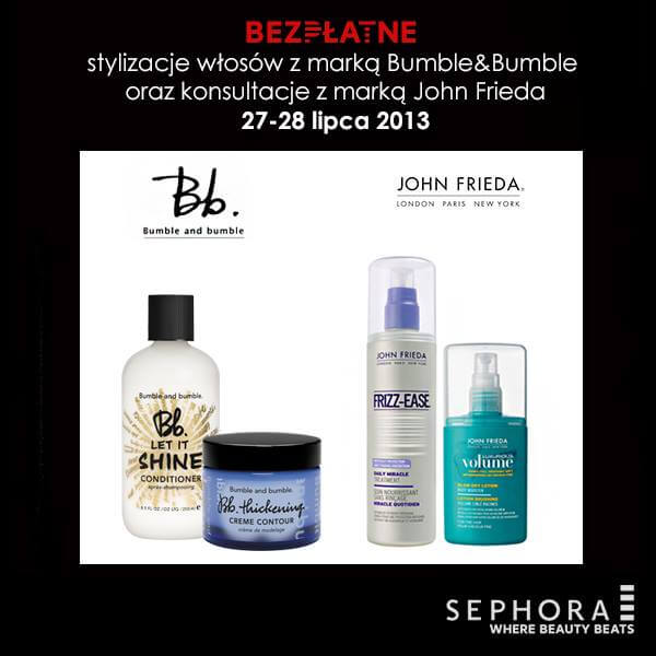 Już w najbliższy weekend (27-28 lipca), w perfumeriach Sephora będzie można skorzystać z bezpłatnej stylizacji włosów z marką Bumble & Bumble lub bezpłatnej konsultacji pielęgnacyjnej z marką John Frieda.