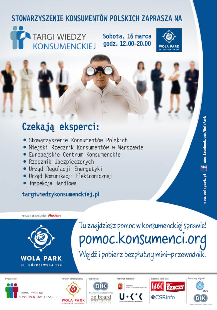 Rzadko walczą o swoje prawa, niechętnie składają reklamacje i zwykle nie czytają umów – konsumenci. O tym, że mają swoje prawa będą mogli przekonać się na Targach Wiedzy Konsumenckiej organizowanych w C.H. Wola Park. Oprócz Stowarzyszenia Konsumentów Polskich w Targach wezmą udział m.in. Urząd Regulacji Energetyki, Urząd Ochrony Konkurencji i Konsumentów, Urząd Komunikacji Elektronicznej, Europejskie Centrum Konsumenckie, Rzecznik Ubezpieczonych, Miejski Rzecznik Konsumentów w Warszawie oraz Wojewódzki Inspektorat Inspekcji Handlowej w Warszawie.