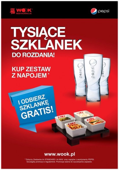 Promocja „Szklanka Pepsi gratis” realizowana jest na zasadzie sprzedaży premiowej w restauracjach sieci WOOK w Warszawie, Łodzi, Wrocławiu, Gdańsku, Poznaniu i Legnicy. Klienci, którzy w okresie trwania akcji zamówią z menu zestaw 4-miseczkowy typu standard bądź max wraz z napojem z asortymentu Pepsi otrzymają w prezencie szklankę o pojemności 0,2 litra.
