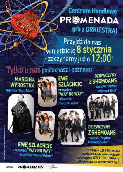 W CH Promenada występować będą Marcin Wyrostek (zwycięzca programu „Mam Talent”), Ewa Szlachcic z zespołem „Way No Way” (finalistka programu „Voice of Poland”) oraz Dziewczyny z Shemoans (znane z programu „Szymon Majewski Show”). Na terenie Galerii będzie można spotkać kwestujących wolontariuszy z gocławskiego Liceum im. Zbigniewa Herberta oraz parlamentarzystów.