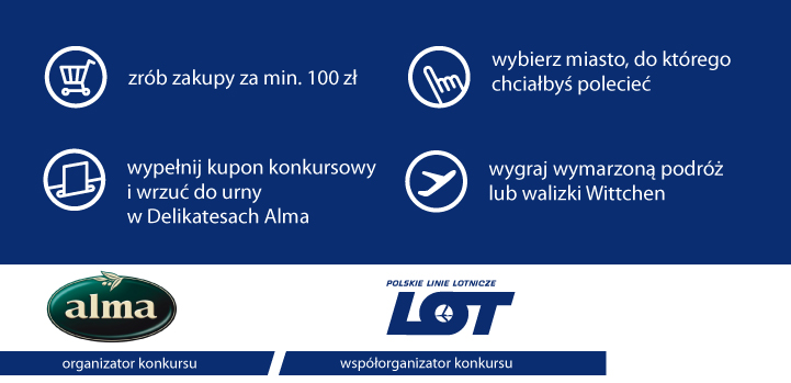 Weź udział w konkursie Delikatesów Alma i wygraj bilet Polskich Linii Lotniczych LOT do wybranego spośród listy krajów.
