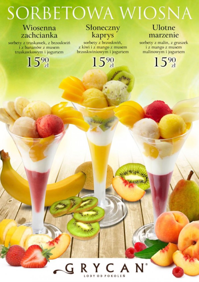 W lodziarniach firmowych Grycan w całej Polsce pojawiły się trzy orzeźwiające desery pełne owoców: Wiosenna zachcianka, Słoneczny kaprys i Ulotne marzenie. W każdej z tych trzech kompozycji sorbety z owoców uzupełnione są lekkimi dodatkami: owocami, jogurtem i musem owocowym.