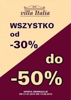 W dniach od 21.07.2012 do 12.08.2012 r. w salonach Villa Italia czeka na Was specjalna oferta promocyjna. Teraz możecie skorzystać ze zniżek -30% i -50% na cały asortyment dostępny w salonach firmowych i w sklepie internetowym.