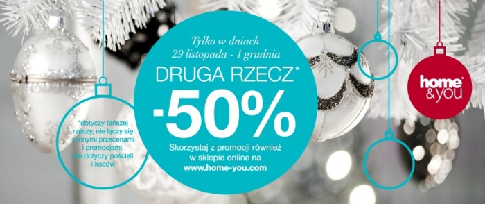 Szukając mikołajkowych upominków dla najbliższych lub świątecznych ozdób i dekoracji, warto skorzystać ze specjalnej promocji w home&you. Od piątku do niedzieli w salonach marki oraz sklepie online trwa akcja Druga rzecz -50%. Akcja obejmuje aktualną ofertę z wyłączeniem kompletów pościeli oraz koców i nie łączy się z innymi promocjami.