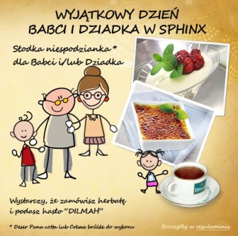 W ramach oferty z okazji Dnia Babci i Dnia Dziadka można wybrać jeden z dwóch deserów – panna cottę lub creme brúlée. Warunkiem otrzymania deseru jest zamówienie herbaty Dilmah i podanie hasła „Dilmah”. Do każdej herbaty przysługuje jeden deser gratis. Informacje o promocji można znaleźć na stronie internetowej Sphinx oraz na profilu sieci na Facebooku.
