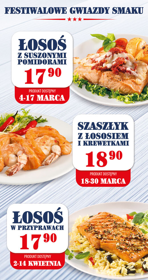 Tylko teraz wyjątkowe okazy łososia w wielu pysznych odsłonach – spróbuj łososia grillowanego, sycącej zapiekanki, świeżej sałatki, rozgrzewającej zupy oraz chrupiącej tortilli.