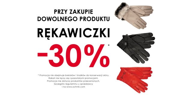 Każdy klient, który zakupi minimum jeden produkt (z wyłączeniem breloków oraz środków i akcesoriów do pielęgnacji skóry) nie objęty żadną promocją, uzyska możliwość zakupienia jednej lub więcej par rękawiczek 30 % taniej.