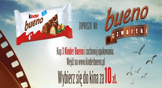 Kup 3 Kinder Bueno lub Kinder Bueno White i wymień opakowania na bilety w Multikinie. Każde 3 opakowania to 1 bilet do kina za 10 zł.