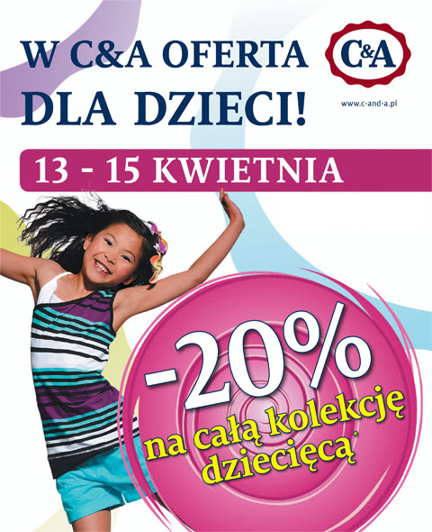 Od 13 do 15 kwietnia br. w sklepach C&A otrzymacie 20% rabatu na całą kolekcję dziecięcą.