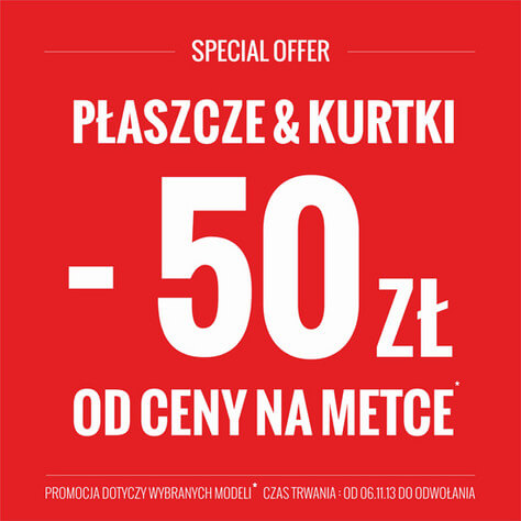 Każdy klient, który w okresie trwania promocji zakupi wybrany model kurtki lub płaszcza otrzyma 50 złotych rabatu na wybrany towar. Promocją objęte są tylko wybrane modele kurtek i płaszczy marki House.