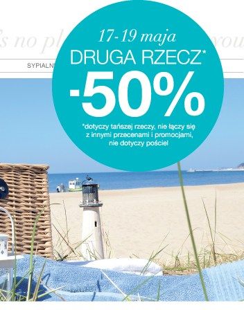 W ramach promocji drugi produkt, tańszy będzie objęty rabatem 50%. Klient może połączyć w pary dowolną ilość produktów. Zniżka nie dotyczy pościeli oraz nie łączy się z innymi promocjami.