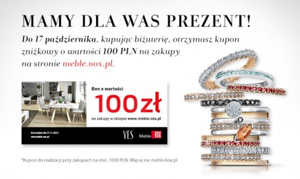 Dokonaj zakupu w dniach od 17 września do 17 października 2012 r. w jednym z salonów jubilerskich YES i otrzymaj bon o wartości 100 zł na zakupy w sklepie internetowym Meble Vox ważny do 17 listopada 2012 r.