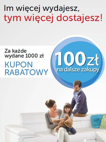 Promocja „Za każde wydane 1000 zł kupon rabatowy 100 zł na dalsze zakupy” obejmuje transakcje (zakup lub zamówienie) wykonane do 16 czerwca. Kupony rabatowe można wykorzystać do 30 czerwca.