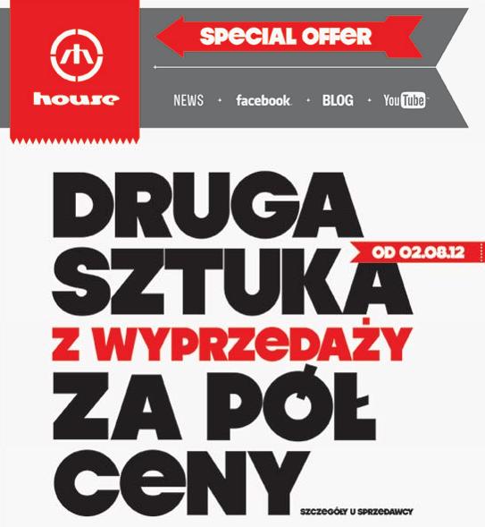 Każdy klient, który w okresie trwania promocji zakupi 1 dowolną rzecz marki House będzie mógł zakupić drugą, tańszą rzecz przecenioną z rabatem -50%.